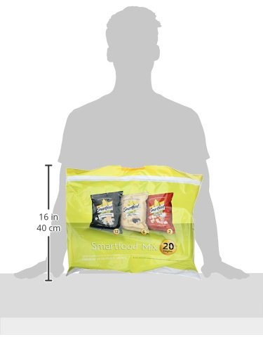 Smart food popcorn variety pack: 12 0.5 Ounce bags of smart food white cheddar, 6 0.5 Ounce. Smart food sweet and salted kettle corn, and 2 0.5oz. Smart food movie theater butter
