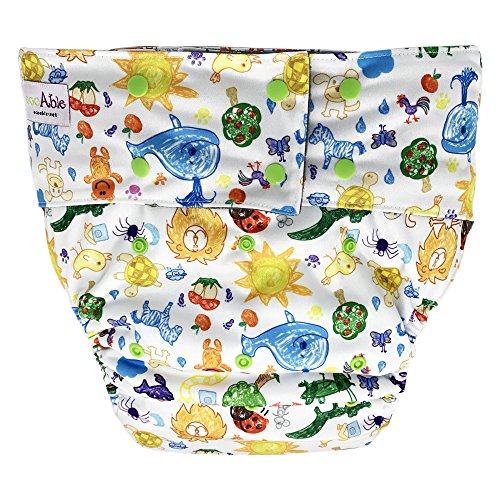 EcoAble Teen & Adult Incontinence Cloth Diaper with Charcoal Bamboo Insert Pad, One Size (Crayon Animals)