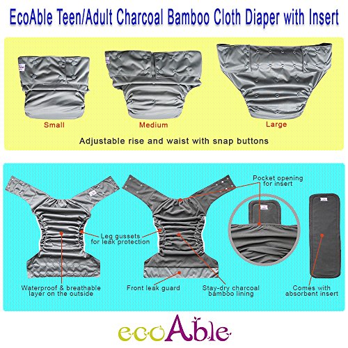 ABSORBENT: Two-part diaper system contains the soft, waterproof diaper shell and an extra absorbent 5 layer Charcoal Bamboo pad. Add extra insert when more absorbency is needed (sold separately). Compatible with EcoAble Teen/Adult Inserts and generic disposables inserts