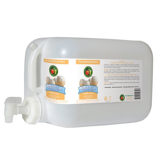 The Earth Friendly Products Proline PL9654/05U vanilla UniFresh air neutralizer and freshener helps neutralize airborne household odors, and is made with biodegradable, plant-based ingredients such as vanilla essential oil, using a pH-balanced formula that reduces risk of damage to fabric. It comes in a five-gallon plastic deltangular container with a vent and a spigot for smooth pouring from a shelf without having to lift the container when filling a dispenser (sold separately). This spray is ready to use, with no water source or dilution ratio measurement required. This product is safe for greywater and septic systems.