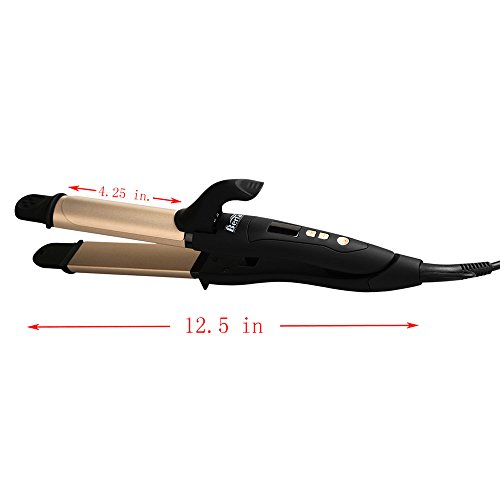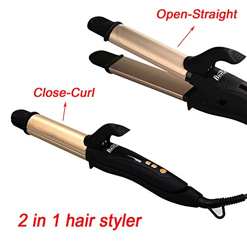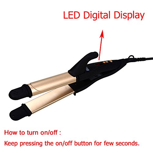 Feature : Digital temperature controls from 275 to 425℉ (120C to 220C), With fast heating function. / US plug, Dual voltage system: 120V to 240V for worldwide use. / The tourmaline technology, ceramic coated plates, tourmaline Ceramic Technology enables plate to produces a potent mass of negative ions. / Auto shut off after 60 minutes when you don't touch it. Press the on/ off button twice quickl can lock all buttons. / Berta 2 in 1 hair straightener and curler, One-year replacement, two-year warranty.