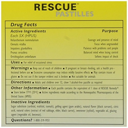-. Binding : Health and Beauty -. Brand : Bach -. EAN : 0741273015574 -. Feature : Keeping a RESCUE product on hand gives you a little help whenever you need it! All the benefits of Bach RESCUE Remedy in a convenient 'grab and go' package. / Help take the edge off your day so you can regain control in stressful situations. / RESCUE Pastilles are a delicious way to keep stress at bay. Soothing, calming and relaxing, pastille contains one dose of RESCUE Remedy. / These are alcohol free and sugar free. The perfect natural supplement for your everyday life. The handy tin is perfect to grab and go! / RESCUE products provide gentle, non-habit-forming every day stress relief. Available in variety of formats, you'll find a RESCUE product that's perfect for you. -. Label : Nelson Bach USA Ltd -. Manufacturer : Nelson Bach USA Ltd -. NumberOfItems : 1 -. PackageQuantity : 1 -. ProductGroup : Pantry -. ProductTypeName : HEALTH_PERSONAL_CARE -. Publisher : Nelson Bach USA Ltd -. ReleaseDate : 2015-05-28 -. Studio : Nelson Bach USA Ltd -. Title : Bach Rescue Pastilles Natural Stress Relief, Black Currant, 1.7 oz -. UPC : 741273015574