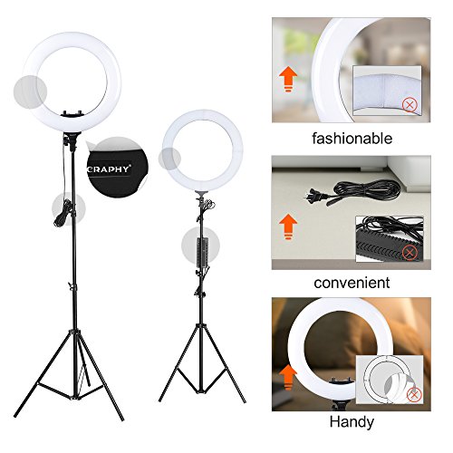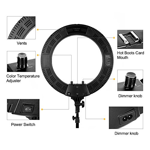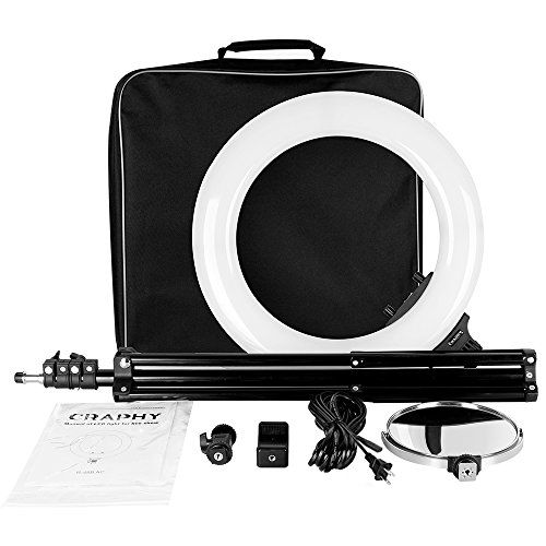 A Must-have for Your Next Video Project The daylight-balanced 18'' LED Ring Light Kit from CRAPHY is an ideal way to achieve soft, nearly shadowless light quality that's flattering to skin, makeup, and close-up portrait.* WOW! No need to replace color films, LED dimmable!