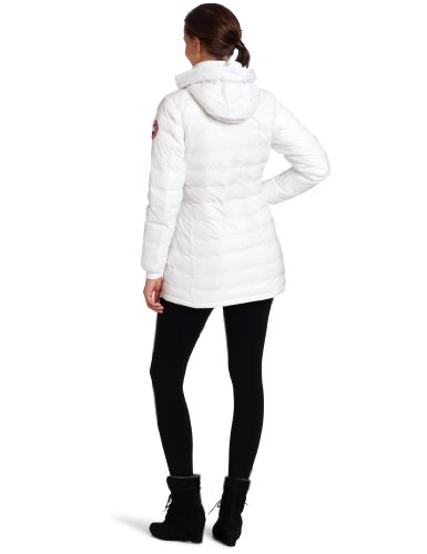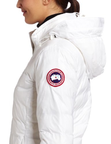 FEATURES of the Canada Goose Women's Camp Down Hooded Jacket Windproof by construction Mid-thigh length provides good protection Down filled collar adjusts with a drawcord to seal out drafts Centre front YKK 2-way locking reversed coil zipper, with Canada Goose logo zipper pull Insulated centre front storm flap that extends over centre front zipper Brushed tricot at chin for comfort Canada Goose logo ribbon runs along centre Two hand pockets secured with YKK reverse coil zippers and zipper pulls Brushed tricot at the back of the neck for increased warmth Internal stretch mesh pocket Integrated hood is constructed at the neckline for versatility and comfort Lycra stretch cuffs for comfort and warmth Brushed tricot lined inner pillow pocket with zipper closureFeature