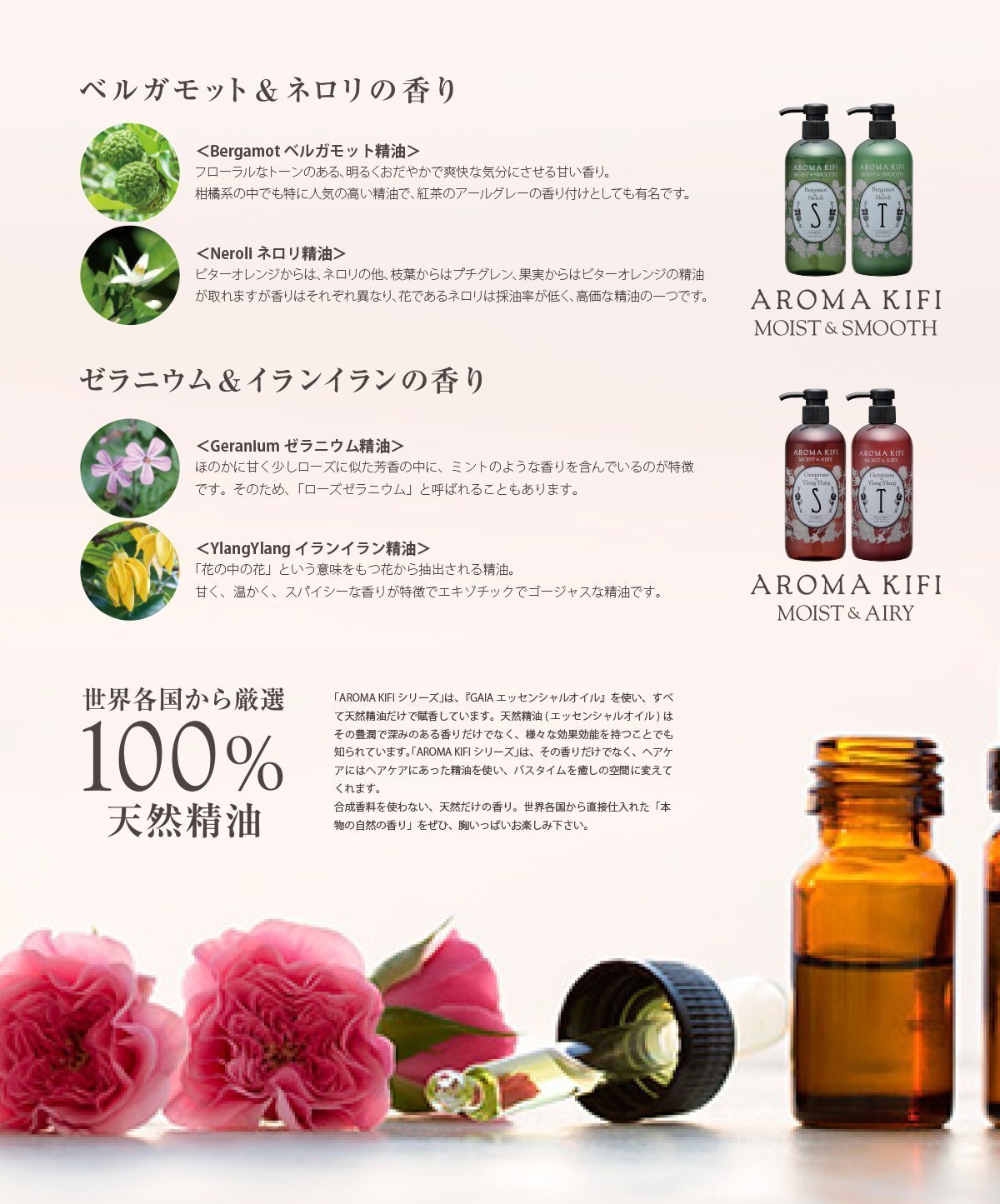 The renewed "Aromakifimoist & Airy" series focuses on the glycosylation of hair and scalp, with the conventional concept of 99% blended plant-derived ingredients, natural scent (organic certified natural essential oil formulation) as it is.