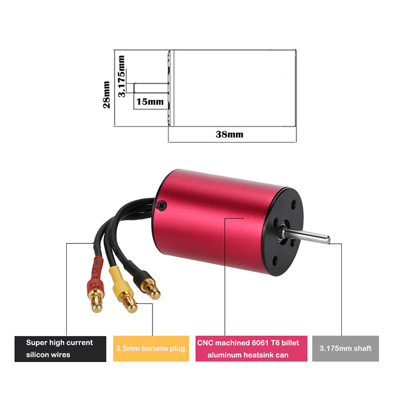 The set includes a S2838 3800KV motor and a 35A ESC, which is perfectly fit for the 1/12 1/14 RC car. This motor is built from the best materials available, and is designed to provide both quality and performance at an affordable price. And it's with high quality aluminum alloy parts that are produced on the latest CNC milling machines. Additionally, the ESC features enhanced throttle response,excellent acceleration, strong breaks and throttle linearity.