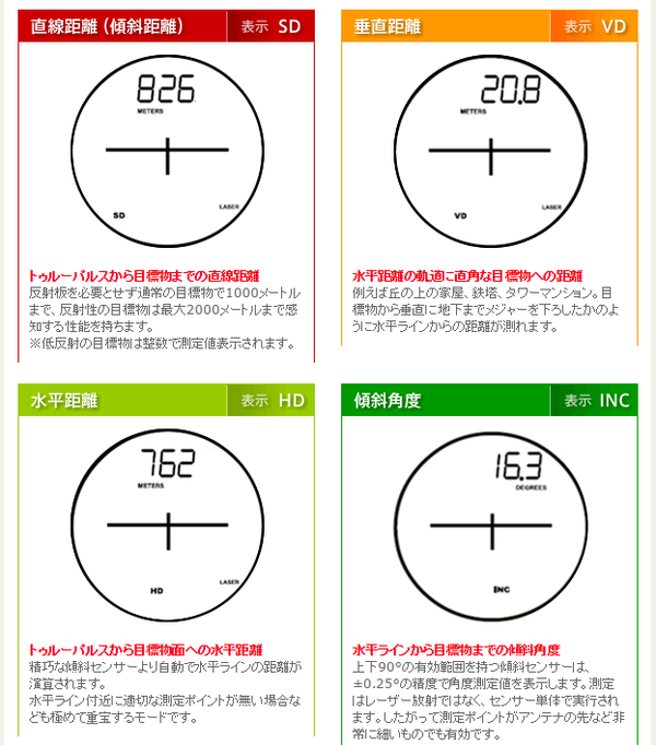 ・測定モード : 直線距離(傾斜距離)、水平距離、垂直距離、傾斜角度、目標物の高さ