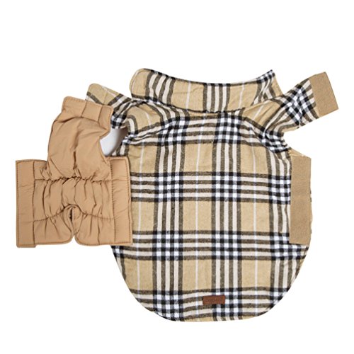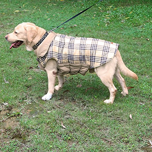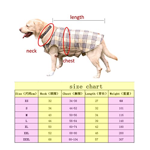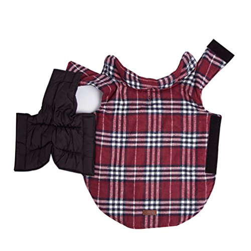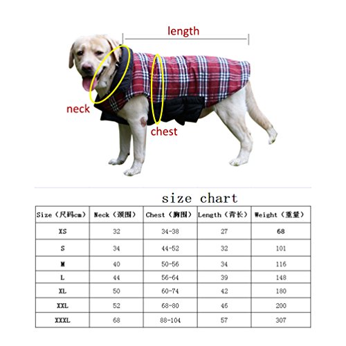 -. Feature : Material:Polyester+Terylene/cotton, water resistant outer layer/soft and warm inner layer. / Features:durable,fashion,vintage , water repellent, fine in detail,lightweight / English design checked water repellent winter apparel pet dog jacket clothing. / Please make sure to measure your dog's back length and chest girth before making your purchase.Winter dog jacket with reversible sides