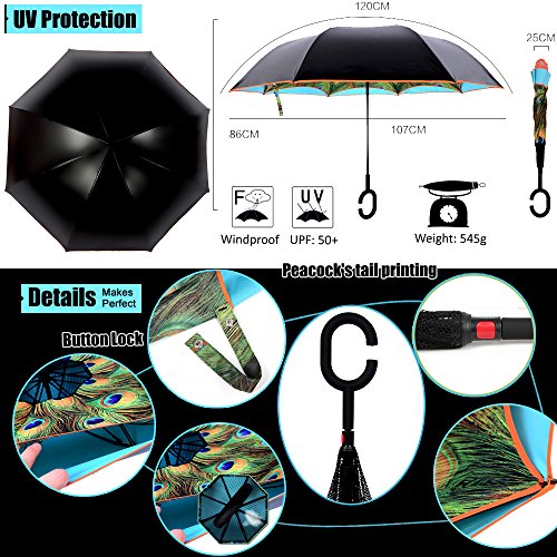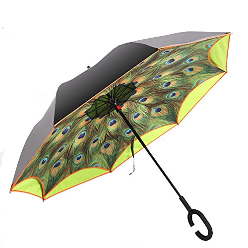 -. Feature : ANTI-ULTRAVIOLET - UPF 50+ Sunscreen fabric production, Double layer protection, Light transmittance is "0", / DRIP FREE - Creative investing design, solved the trouble exist over 3000 years, inside-out design prevents water from dripping, keeping floors and cars dry / SPECIAL FOR DRIVER - Made entering and exiting a car less of a hassle. Didn't have to close BEFORE entering or eventually get wet trying to close once in the car, because the new design can escort you easily in a perfect opening/closing angle. / NEATLY SAVING THE ENVIRONMENT - Self Standing when closed, but not held tight by the velcro close strap, until it drips dry. No need to keep the umbrella open to drip dry when bring it inside in rainy day. It takes up less space in a hallway or foyer that way, and no one can trip over it. / HANDS FREE - Good for phone user and mothers, Cross the C-shape handle over your arm, made you hands free for holding a baby, bag or mobile if needed, 25" Golf Size, PEACOCK'S TAIL P.R.INTING - Proud as a Peacock