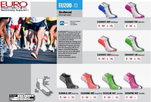 -. Binding : Sports Apparel -. Brand : Eurosocks -. Color : White/Royal -. Department : mens -. Feature : This line of light weight Marathon running socks are engineered to embrace the foot ensuring a snug fit like a second skin, eliminating wrinkles, hot spots or pressure points / Low density padding creates high performance protection, relieves foot stress, eliminates abrasions providing athletes support, circulation and comfort / Silver Drystat our exclusive fiber for optimum moisture wicking capabilities, reducing growth of bacteria and fungus for a healthier foot environment, Dry Feet = Less Blisters, (Learn more about the benefits in the product description section) / Available Sizes: Women's (Small 5-8) (Medium 8.5-10) (Large 10.5-12) Men's (Small 4-7) (Medium 7.5 - 9) (Large 9.5 -11) (X-large 11.5 -14) Due to the stretch-ability of the sock, if your shoe size is between sizes, choose the smaller -. Label : Eurosock -. Manufacturer : Eurosock -. Model : EU200-P -. PackageQuantity : 1 -. ProductGroup : Sports -. ProductTypeName : OUTDOOR_RECREATION_PRODUCT -. Publisher : Eurosock -. Size : Small -. Studio : Eurosock -. Title : Eurosocks EU200 Marathon Ultra Light Weight Low Cut Running Socks-Pair