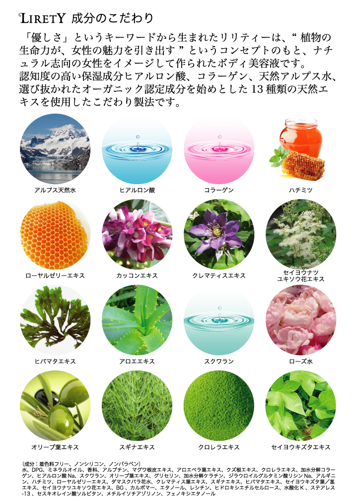 水、DPG、ミネラルオイル、香料、アルブチン、マグワ根皮エキス、アロエべラ葉エキス、クズ根エキス、クロレラエキス、加水分解コラーゲン、ヒアルロン酸NA、スクワラン、オリーブ葉エキス、グリセリン、加水分解ケラチン、ジラウロイルグルタミン酸リシンNA、アルギニン、ハチミツ、ロイヤルゼリーエキス、ダマクスバラ花水、クレマティス葉エキス、スギナエキス、ヒバマタエキス、セイヨウキズタ葉/茎エキス、セイヨウナツユキソウ花エキス、BG、カルボマー、エタノール、レシチン、ヒドロキシエチルセルロース、水酸化K、ステアレス-15、セスキオレイン酸ソルビタン、メチルイソチアゾリノン、フェニキシエタノール カテゴリ:リリティー