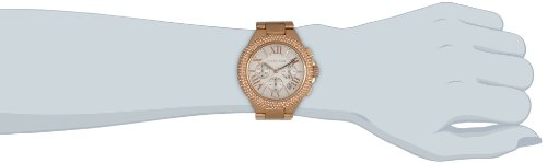 Rose gold-tone stainless steel case and bracelet. Fixed rose gold-tone bezel set with crystals. Silver white dial with rose gold-tone hands and alternating Arabic numeral and stick hour markers. Minute markers around the outer rim. Dial Type: Analog. Date display between 4 and 5 o'clock positions. Chronograph - three sub-dials displaying: 60 second, 60 minute and 24 hour. Quartz movement. Scratch resistant mineral crystal. Pull / push crown. Solid case back. Case diameter: 43 mm. Case thickness: 12 mm. Round case shape. Band width: 21 mm. Band length: 7 inches. Deployment clasp. Water resistant at 100 meters / 330 feet. Functions: chronograph, date, hour, minute, second. Dress watch style. Michael Kors Camille Chronograph Rose Gold-tone Ladies Watch MK5636.Feature