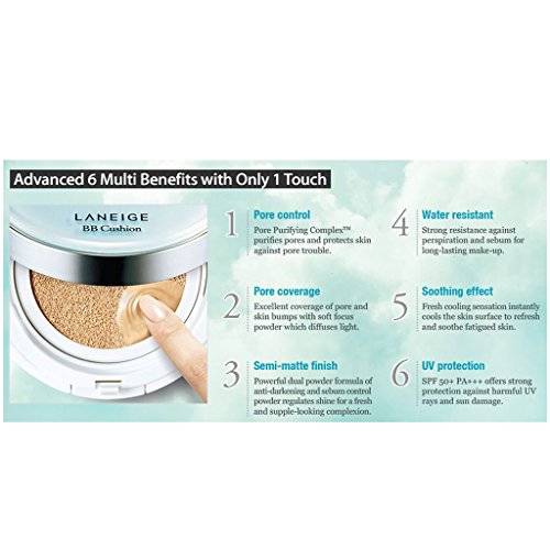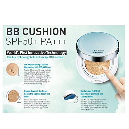 Laneige BB Cushion Pore Control gives you a refined skin complexion Containing anti darkening powder to prevent oxidation, Effectively hides enlarged pores while skin tone stays light. Also, This offers super UV protection coupled with a sweat-proof formula-Ensures long wearing of foundation on skin in hot climatesFeature