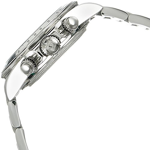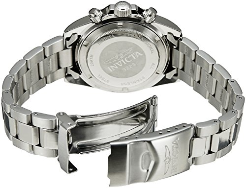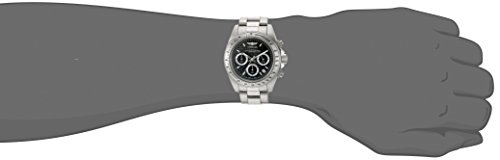 Classically styled and channeling your need for speed, the Invicta Speedway Chronograph S watch for men (model 9223) offers a bold accent to both business wear and casual dress. The three chronograph subdials can measure time within intervals of 1/60 of a second and up to 30 minutes of elapsed time, and it features start, stop, and reset functions. The round silver stainless steel watch case measures 43mm (1.69 inches) with engraved units per hour markings on the bezel. It has a black dial background with silver subdials, luminous Tritnite hands (with seconds hand), and small minute indexes. Other features include an anti-reflective mineral crystal, silver stainless steel bracelet band, date function at 4 o'clock, and water resistance to 200 meters (660 feet).