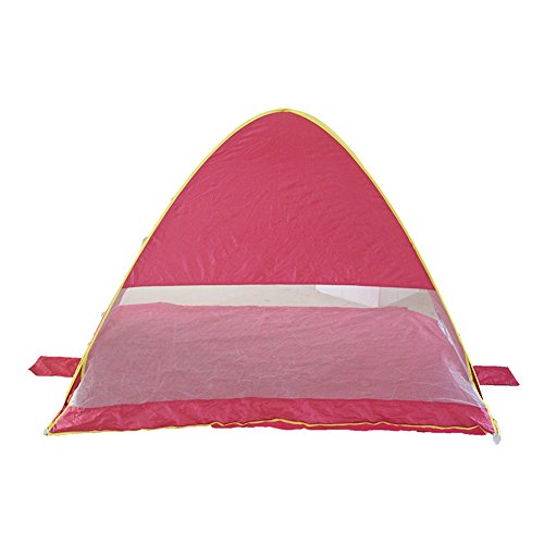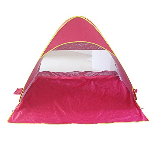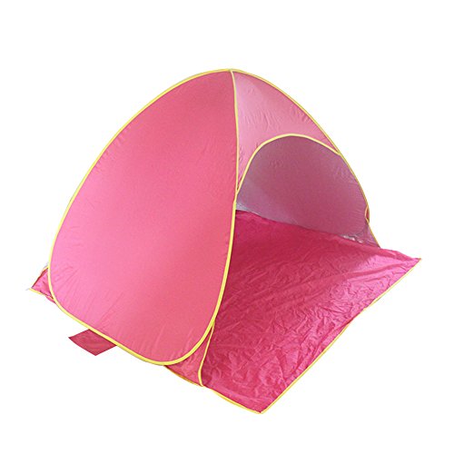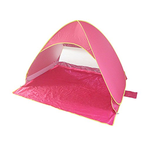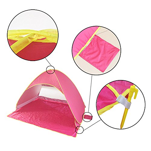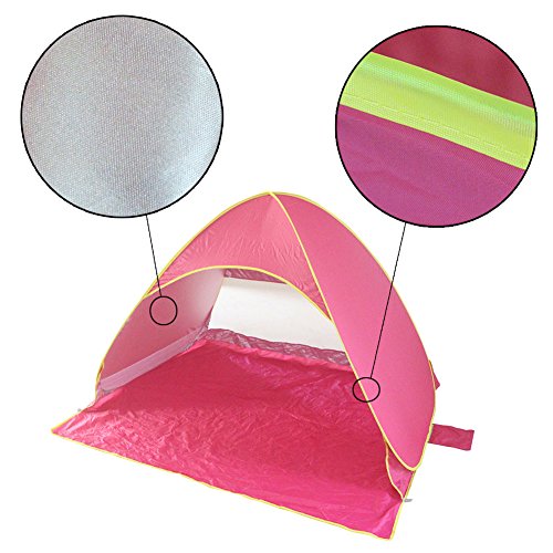 Pop up outdoor tent; self-expands in 1 second, folds down in 3 seconds. Durable 210T polyester; CPAI-84 flame retardant material 50 UPF rating for sun protection. Lightweight and easy to carry; comes with carrying bag with shoulder strap. Large mesh window allows good ventilation. Strong steel beam frame; durable and lightweight. 6 mental ground stakes included; sand bag pockets on side panels for stabilization.