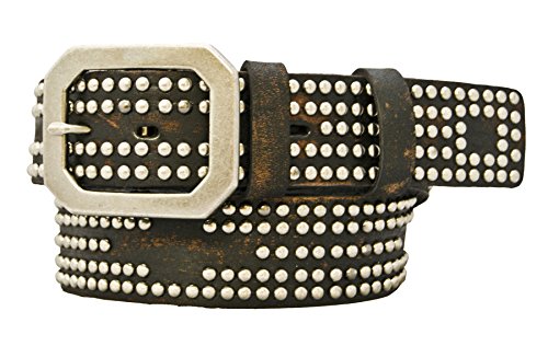 This full-grain hand-distressed leather strap has been vintage tumbled for a more flexible and softer feel. It is adorned with an antique silver-plated studded cross pattern across the length and an angled square antique silver-plated center bar buckle.Feature