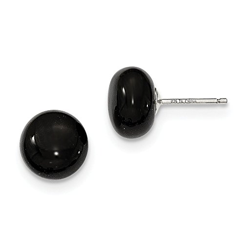 Solid 925 Sterling Silver 10-10.5mm Button Black Simulated Agate Post Earrings