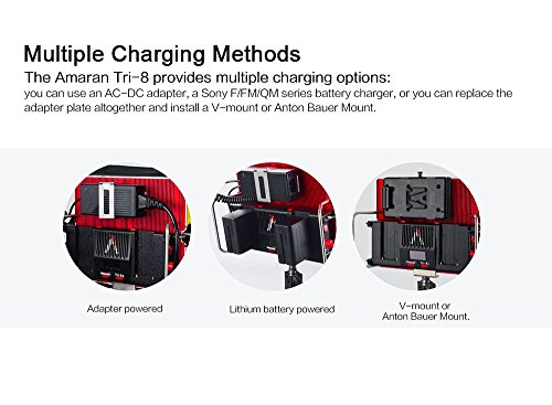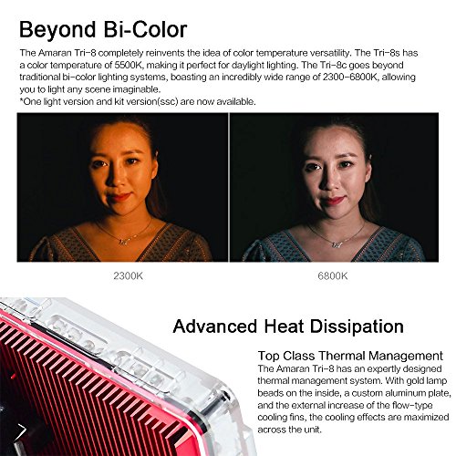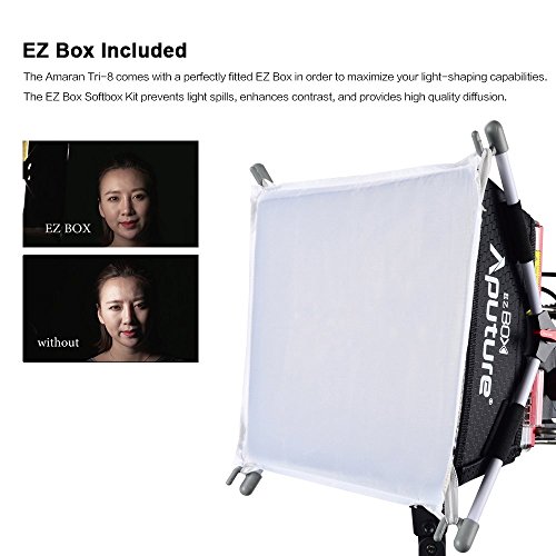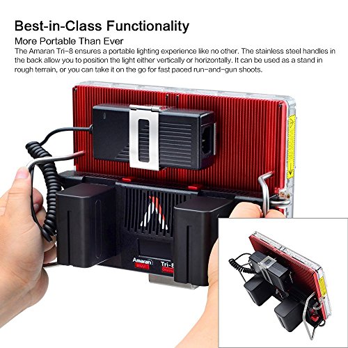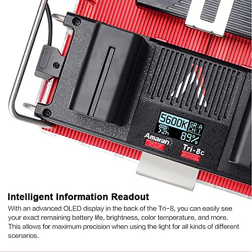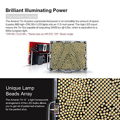 Studio : Aputure Publisher : Aputure Binding : Electronics Product Description The Amaran Flagship Tri-8 is the brightness and most compact led light ever of Amaran series. With Durable metal construction, ultra thin design and excellent thermal management capabilities, it packs 888 high CRI (95 ) LED lights into an 11.5-inch panel. If you already own the Amaran 528/672 series or even the Light Storm LS1-LS1/2, these upgrades in the Amaran Tri8 are plenty of reasons for adding to your kit. With 25-30% more power, better battery security, more power options and an extremely durable body, the Amaran Tri8 is an extremely versatile and durable solution for many lighting needs! The stainless steel handles in the back allow you to position the light either vertically or horizontally. It can be used as a stand in rough terrain, or you can take it on the go for fast paced run-and-gun shoots SPECIFICATIONS: Model:Tri-8c Operation Current: 4A Power Supply: DC 15V Power Input: 60W Beam Angle: 25° Color Temperature: 2300K-6800K Average Life Span: ≥100,000 hours Cooling Mode: Natural Convection Heat Transfer Radio Frequency: 2.4GHz Channels: 1/2/3 Group: A/B/C/D Remote Range: ≤150m Sizes(L*W*H): 260.99*198.64*93.15mm Brightness 0.5m: 2137 Footcandles(ftc) 1m: 604 Footcandles(ftc) PACKAGE CONTENTS: 1* Tri-8C Led Light 1* Diffuser 1* D-tap to D-tap 1* AC adapter Power Cable 2* F970 Batteries 1* VA-Remote 1* EZ Softbox Diffuser 1* Carrying Bag for Tri-8c 1* PERGEAR Cleaning Kit 0 |