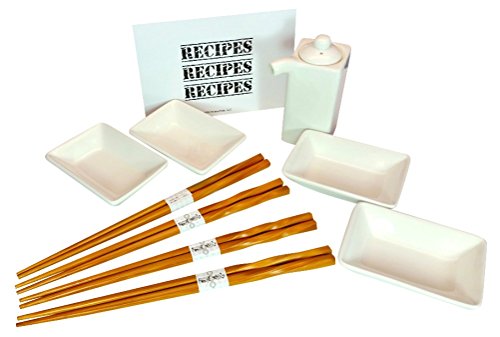 Sushi Dish Set, Soy Sauce Dispenser, Bamboo Chopsticks with Bonus Recipe Card