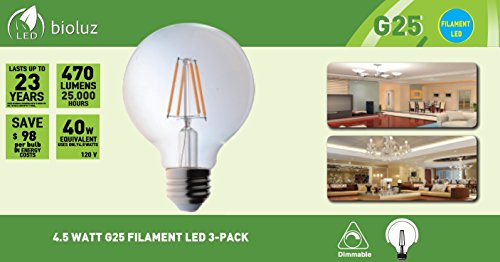 6 Pack Bioluz LED Clear Dimmable Filament LED G25 Globe 40 Watt Replacement (Uses 4.5 Watts) Warm White (2700K) LED Light Bulb 470 Lumens UL Listed & Great Vanity Bulbs
