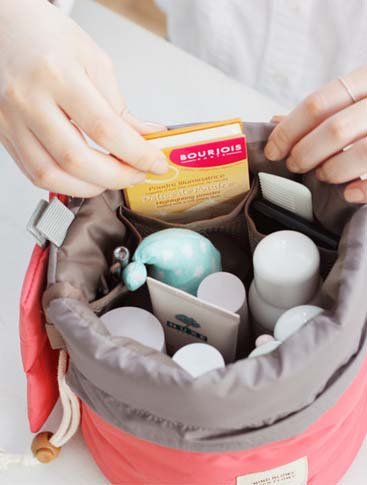 1.This bag has elastic straps and mesh pockets to ensure all your beauty items have a place. There is a small bag and a plastic pocket for your brushes. Plenty of room for makeup, hair products and other misc bathroom necessities. Nice thick bag with a drawstring cord