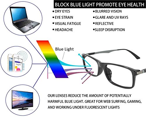 -. Feature : PROTECT YOUR EYES AND SLEEP BETTER - our computer reading glasses block blue light than any other normal glasses. Anti-Reflective, Anti-Glare lens coating prevents insomnia and macular degeneration, wear the anti blue ray glasses ensure you better sleep and greatly reduce eye strain, eye dry and headaches.All of glasses are tested by professional machine / YOUR MONEY SPEND IS WORTH IT - wear our computer reading glasses also called gaming glasses,blue light blocking glasses when you staring at computer,gaming,palying with smartphone and other electronic devices in office,at home,at bed etc,the glasses make computer users and gamers feel comfortable and no strain from screen radiation / SUPERB DURABILITY - our blue light filtering glasses pay close attention to "lens not clear""hinges loose up""screws fell off""broken easily",we use high quality computer lenses, heavy duty spring-loaded hinges,sure-flex comfortable arms,quality credible material ensure glasses withstand your daily and long term eye protection,which outshine roughly made gaming glasses / ENHANCE YOUR ATTRACTIVENESS - how you look is as important as how clearly you can see, Fashion comfortable style and special design of the computer reading glasses enrich you more attractive / AMAZING CUSTOMER SERVICE - After you purchase our anti blue glasses,if you encounter following situation: wrong fit ,Pinchy-tight, or too-loose , which slide down your nose are enough to drive anyone crazy,In case any broken problem happens, contact the seller of EyeYee without hesitation to solve the problem until satisfaction. 90days money back lifetime lens and frame breakage warranty. You have no risk to try