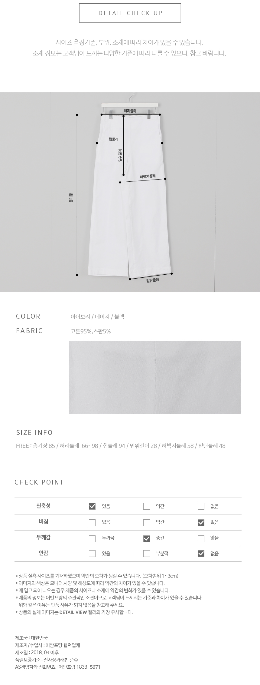 소재는 코튼95%,스판5% 색상은 아이보리, 베이지, 블랙 사이즈는 FREE 44~66반