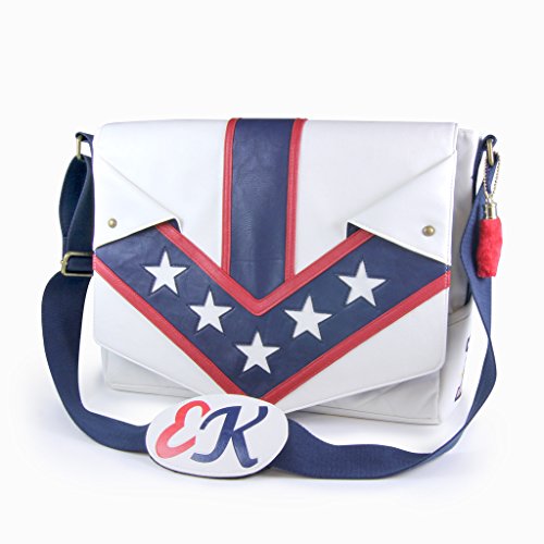 -. Brand : Evel Knievel -. Color : Multi-colored -. EAN : 0810671026717 -. Feature : Evel Knievel fans will not want to let this pass them by! This Evel Knievel Jumpsuit Messenger Bag is made of sturdy faux leather, and has been inspired by Evel's iconic white leather jumpsuit. Bag features a spacious main padded inner compartment able to hold a laptop up to 15-inches wide, along with a front organizer pocket. -. IsAdultProduct : 0 -. Label : The Coop -. Manufacturer : The Coop -. MPN : EKL114 -. NumberOfItems : 1 -. PackageQuantity : 1 -. PartNumber : EKL114 -. ProductGroup : Sports -. ProductTypeName : OUTDOOR_RECREATION_PRODUCT -. Publisher : The Coop -. Size : 16" -. Studio : The Coop -. Title : Evel Knievel Jumpsuit Messenger Bag -. UPC : 810671026717