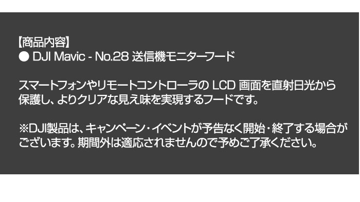 特長DJI Mavic専用送信機モニターフード!スマートフォンやリモートコントローラーのLCD画面を直射日光から保護し、よりクリアな見え味を実現するフードです。
