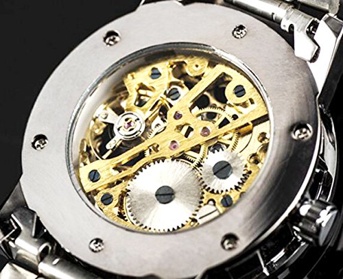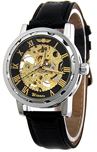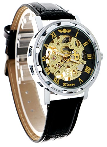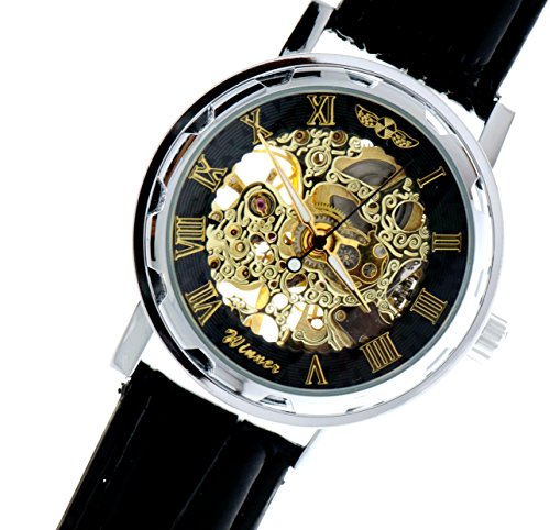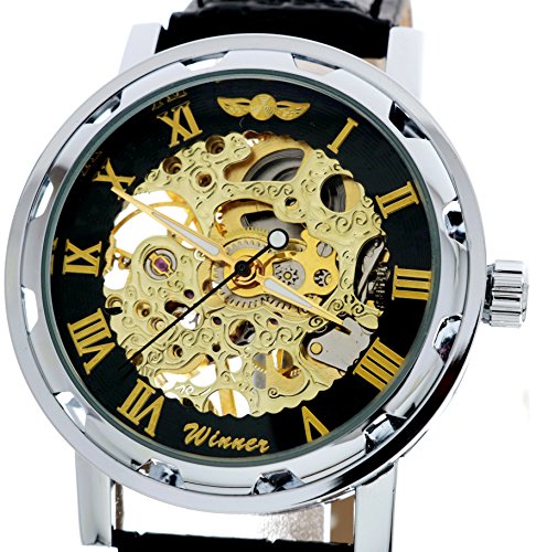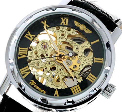-. Feature : simple Mechanical Watch with Steampunk Fashion Design. Unisex / High quality gives you a new classic definition. / Best gift to your lover,Partner, family, friends, classmates, colleagues / Skeleton See Through Watch Dial with Roman Numerals, Silver Watch Case Match the Gold tond Dial with Black / please note that you need to hand wind the time of the Mechanical Wrist Watch frequently