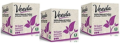 Veeda Natural All-Cotton Tampons, Super, Compact Applicator, 3 Boxes of 16 Count Each