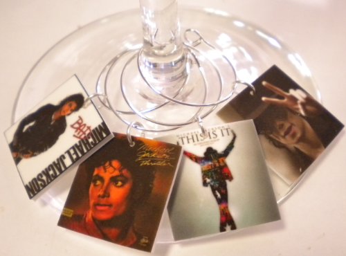 -. Binding : Kitchen -. Brand : FortySevenGems -. Color : Multicolor -. Feature : Measures Approximately 1/2" / All Rings Included / Includes a Beautiful Gift Bag Optional Personalized Gift Card / Random Covers Sent / Printed image on plastic with a matte sealant and are water resistant not water proof -. IsAutographed : 0 -. Label : FortySevenGems -. Manufacturer : FortySevenGems -. MPN : 6MJacksonAlbumCover -. PartNumber : 6MJacksonAlbumCover -. ProductGroup : Kitchen -. ProductTypeName : KITCHEN -. Publisher : FortySevenGems -. Studio : FortySevenGems -. Title : FortySevenGems Set of 6 Michael Jackson Album Cover Collection Wine Charms Mailed in a Pretty Organza Gift Bag
