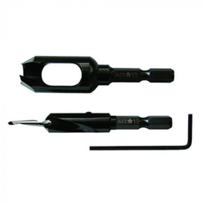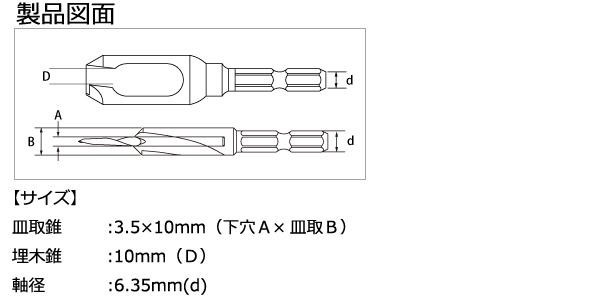 | サイズ | 皿取錐:3.5×10mm(下穴A×皿取B)、埋木錐:10mm(D)、軸径:6.35mm(d) 個装サイズ:16×7×3cm |