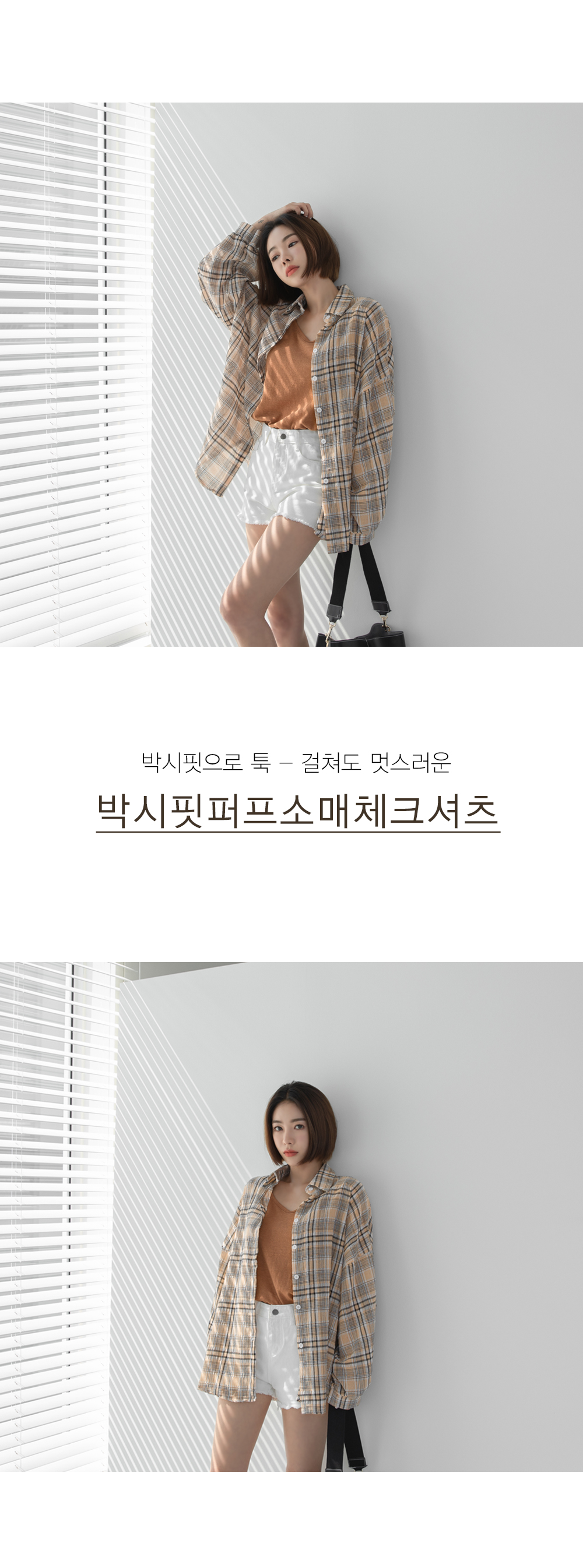 DETAIL TIP 박시핏으로 체형커버에도 좋으며 아우터용으로 툭 걸쳐도 멋스러운 체?셔츠에요! 모델언니처럼 다양하게 연출하여 착용하실 수 있구요~ 퍼프소매로 디자인에도 신경쓴 아이랍니다^0^br>데일리 아이템으로 강추드려용>_ SIZE TIP F(44~77)사이즈로 추천드리구요~ 아래 상세 사이즈 확인 후 결정해주세요~!