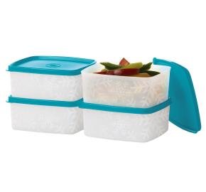 Tupperware Freeze-It set of 4 Small Deep Squares with Tropical Water seals - Square Rounds Freezer Containers. Specifically designed for freezing and storing. Stack for convenient storage. Pliable, supple Tupperware plastic material allows you to give a gentle twist to remove frozen contents. Lightly textured exterior with embossed snowflake design. Not designed for microwave use. Dishwasher safe