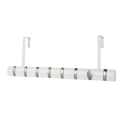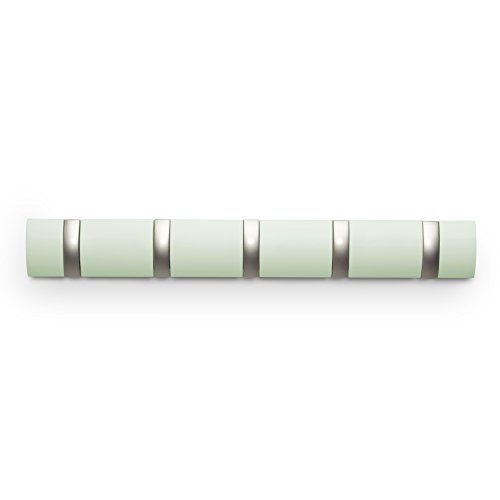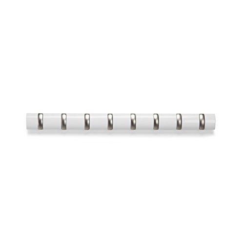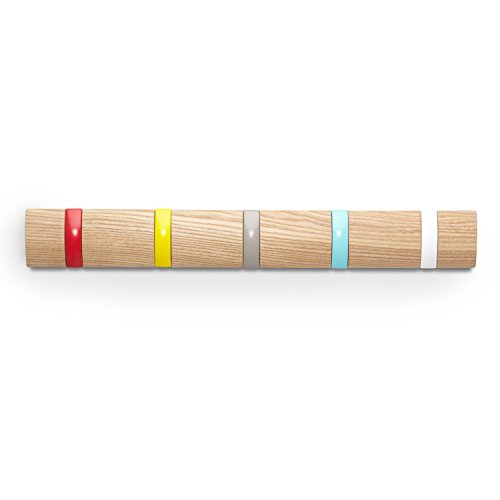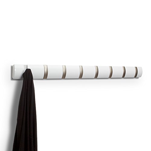 The Umbra Flip wall mount multi-hook unit boasts a clever design- the wooden rack features 5 hooks that flip up and down. When not in use, each hook slips neatly into the rack for a sleek, space-saving look. Constructed of hardwood with brushed nickel-plated hooks; available in White, Natural and Espresso finishes. Unit measures 1x3x20 inches overall. Mounting hardware is included. Designed by David Quan for Umbra- original, modern, casual, functional and affordable design for the home.