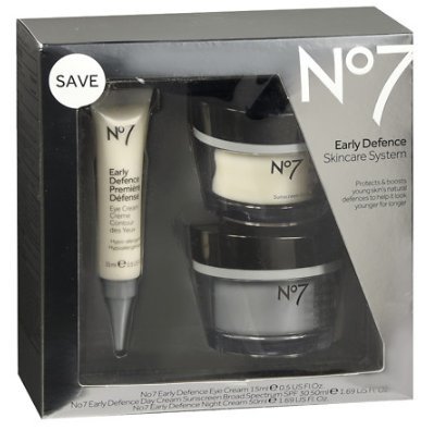 -. Binding : Misc. -. Brand : No. 7 -. EAN : 7326675421043 -. Feature : Protects & boosts young skin's natural defences to help it look younger for longer / No7 Early Defence Eye Cream 15 mL (0.5 fl oz) / No7 Early Defence Day Cream Sunscreen broad spectrum SPF 30 50 mL (1.69 fl oz) / No7 Early Defence Night Cream 50 mL (1.69 fl oz) -. IsAdultProduct : 0 -. Label : The Boots Company PLC -. Manufacturer : The Boots Company PLC -. MPN : NA -. PartNumber : NA -. ProductGroup : Beauty -. ProductTypeName : BEAUTY -. Publisher : The Boots Company PLC -. Studio : The Boots Company PLC -. Title : No7 Early Defense Skincare Kit ( pack of 1)