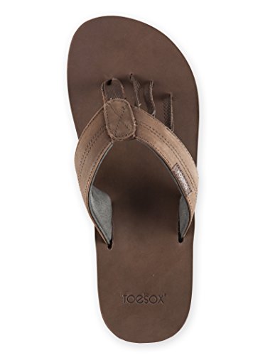 Studio : Toesox Publisher : Toesox Binding : Apparel Product Description Toesox Men's Encino Leather Five Toe Sandals - Walnut Enjoy the outdoors with the Toesox Encino Sandals. A casual and refined design that pairs well with sand, salt water and open air. Features: Genuine leather strap and toe separators Soft and durable genuine leather lining Pitched toe for enhanced rebound Comfy yoga mat midsole Footbed cradles heel for proper positioning and comfort Durable rubber outsole 0