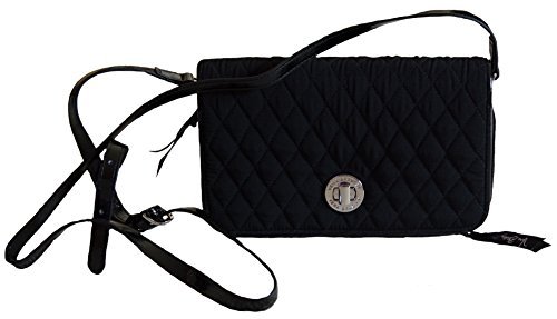 Vera Bradley quilted cotton crossbody bag with faux-leather trim and turn lock closure. Convenient 12 slip card holder and zip area as well as large slip pocket in zippered compartment under flap. Clear ID holder on inside of flap. Second large open compartment under flap. Slip pocket on back of bag.