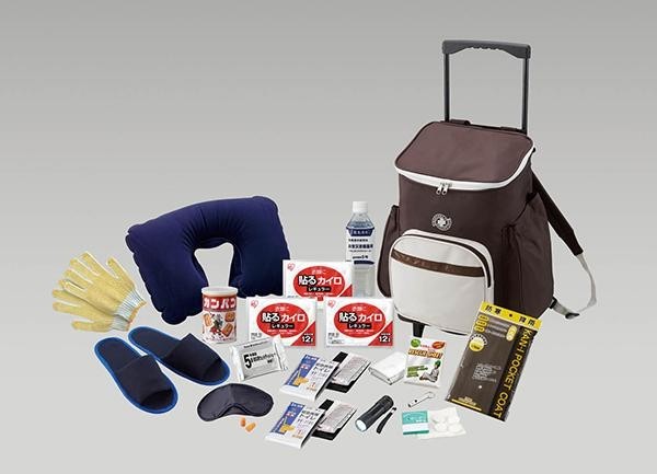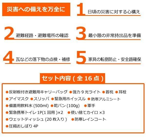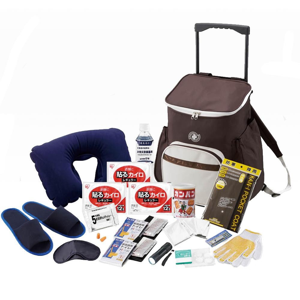 | セット内容 | 反射板付き避難用キャリーバッグ、強力9光ライト、首枕、耳栓、アイマスク、スリッパ、緊急用ホイッスル、レスキューシート、備蓄用飲料水(500ml)、乾パン(100g)、軍手、緊急携帯トイレ1P(1回用)×2、使い捨てカイロ×3、ウェットティッシュ(20枚入り)、防寒レインコート、圧縮おしぼり4P |