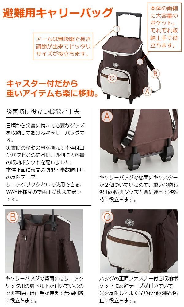 | 素材・材質 | 反射板付き避難用キャリーバッグ:ポリエステル、PVC、ABS樹脂 |
