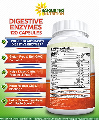 -. Feature : HELPS REDUCE INDIGESTION, BLOATING & GAS: aSquared Nutrition's maximum strength Digestive Enzymes formula contains 18 plant based digestive enzymes in each capsule and 120 capsules per bottle. Our complex aids in the digestion of carbohydrates (carbs), proteins, fats, grains, gluten, sugar, dairy, fruits and vegetables. Additionally, our formula has been shown to help prevent or lessen symptoms of heartburn, nausea, cramps, diarrhea and constipation. Our formula is GLUTEN-FREE & NON-GMO. * / 18 PLANT BASED DIGESTIVE ENZYMES: Our digestive enzyme complex helps the body naturally digest and absorb nutrients. It contains 18 plant-based digestive enzymes including Protease, the proteolytic enzyme Aspergillopepsin, Amylase, Lipase, Cellulase, Glucoamylase, Invertase, Alpha Galactosidase, Beta Glucanase, Pectinase, Xylanase, Phylase, Hemicellulase, Lactase, Bromelain, Papain and Peptidase. These natural enzymes help your digestive system work fast to break down food into nutrients. * / GLUTEN-FREE & NON-GMO: Our potent blend of 18 digestive enzymes is a full spectrum, gentle, and effective digestion aid that supports nutrient absorption and may increase energy levels. Our natural plant-based digestive enzymes may help reduce symptoms of Irritable Bowel Syndrome (IBS), acid reflux, food intolerances, bloating, gas and indigestion. It helps with the digestion of foods such as gluten, lactose and fiber, as well as the proteins in beans, nuts, dairy, legumes and grains. * / BEST VALUE AVAILABLE ON AMAZON: Backed by our 100% MONEY BACK GUARANTEE for 30 days, each bottle contains 120 capsules, not to be mistaken for other forms of digestive enzymes such as powder, liquid drops, lozenges caps, vegetarian softgels, chewable gummies, vegan tablet, gummy chews, oil gel lotion, spray, jelly packets, gum tabs, vcaps, drink juice, and syrup. * / PROVEN TRACK RECORD: aSquared Nutrition takes pride in quality. You'll love our product line from CoQ10 400mg (Coenzyme Q10) to Garcinia Cambogia. New products include our Rhodiola Rosea, Caralluma Fimbriata, Candida Cleanse, Organic Ceylon Cinnamon (All Natural), Milk Thistle 1000mg, Resveratrol, DHEA 100mg, CLA 1250, Turmeric Curcumin (vegetarian), Green Coffee Bean Extract, Panax Ginseng (vegetarian), Krill Oil 1000mg, Green Tea Extract 500mg, Colon Detox & Cleanse, & Berberine. *
