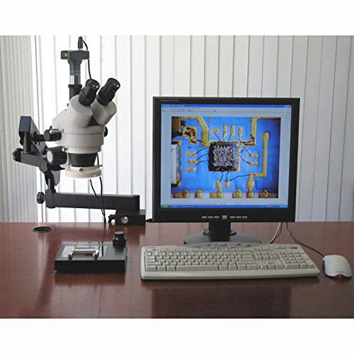 Professional stereo microscope on articulating arm has long working distance to enable users to perform work or manipulate large items, including circuit boards and dental appliances