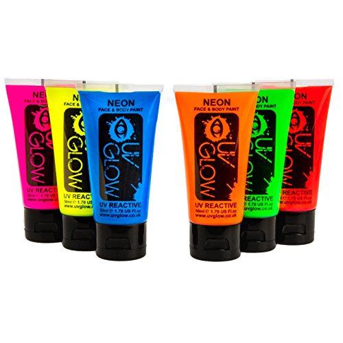 -. Feature : UV Reactive - Glows Brightly under UV Light / Premium Quality / 6 Bright Neon Dayglow Colours / Dries Quickly and washes off easily with water / Ideal for Clubbing, Festivals and anywhere with UV Lighting
