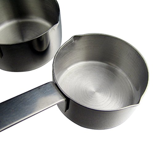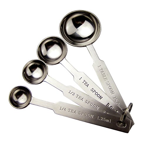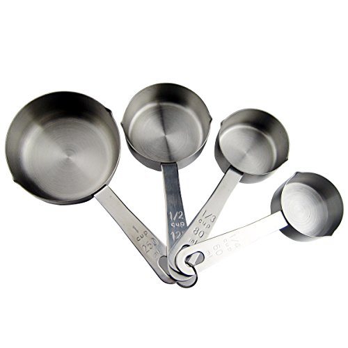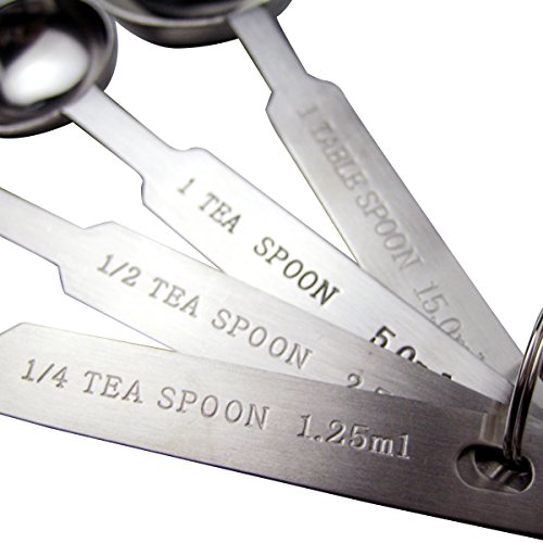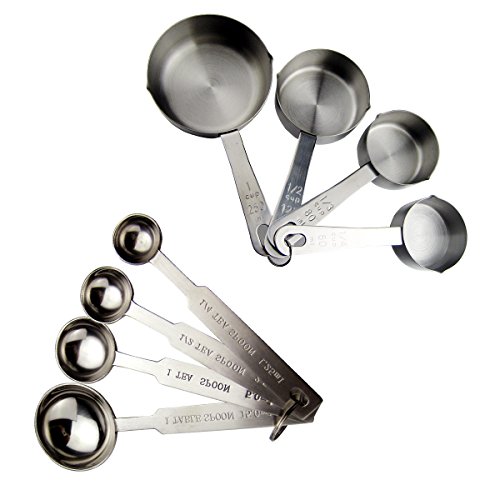 - Your new complete set includes 8 stainless steel measuring cups (1/4 cup, 1/3 cup, 1/2 cup, 1 cup) and 4 measuring spoons (1/4-tsp, 1/2-tsp, 1-tsp, 1-Tbsp). With 100% precise and accurate measurements in both American and Metric units! These cups and spoons are conveniently connected by a small ring which helps to keep the cups and spoons together as a set after a full day of baking or cooking.
