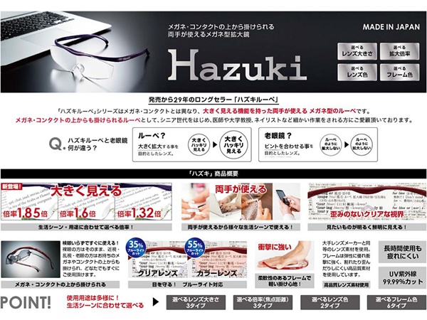●ハズキルーペはメガネ・コンタクトの上からも掛けられ両手を自由に、様々なシーンで使えるメガネ型拡大鏡です。