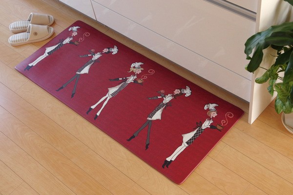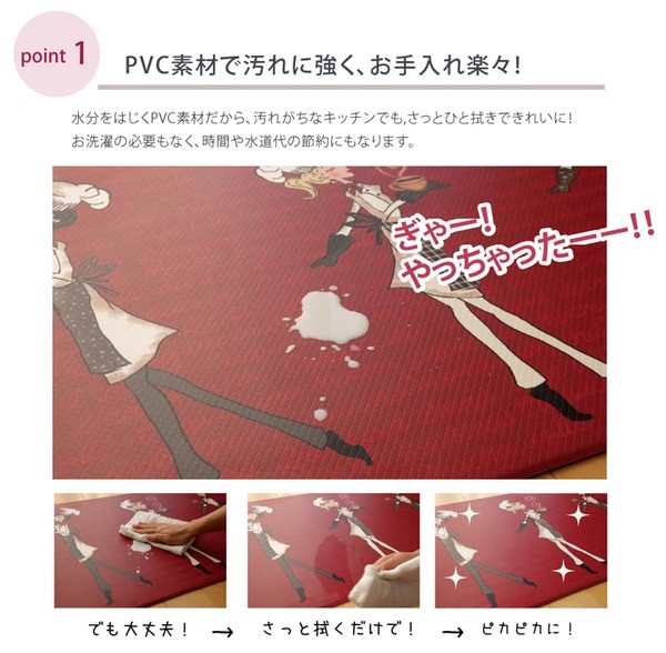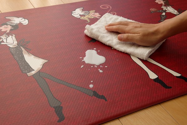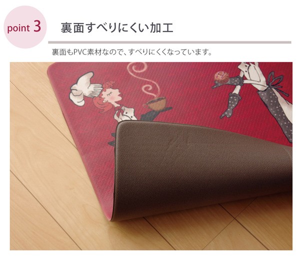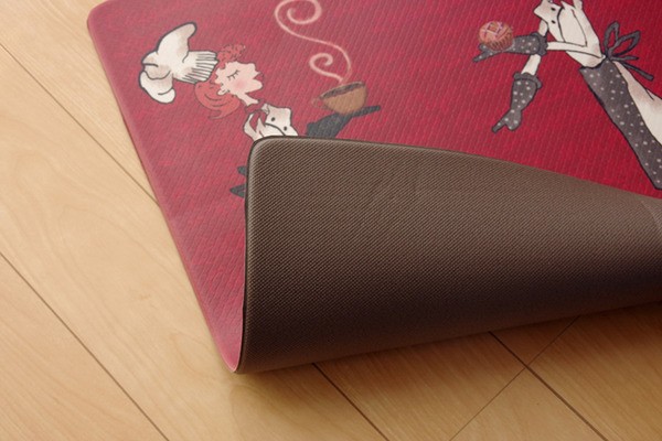 お手入れの簡単なPVCを使用したキッチンマットです。汚れた際もさっと拭き取れば汚れにくく簡単にお手入れができます。裏面もPVCを使用しているため滑りにくく、クッション性があるため足が疲れにくい商品です。