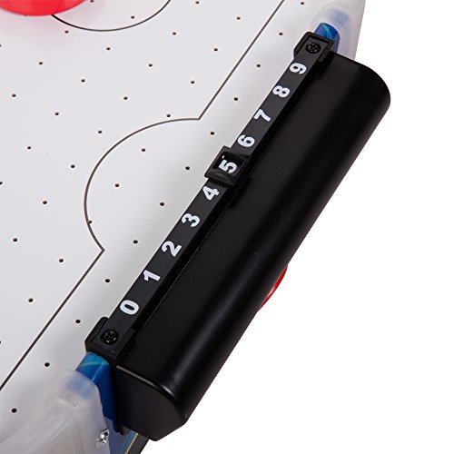 Easily keep track of score by using the manual scorers, also includes 2 pushes and 2 pucks