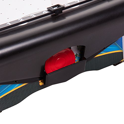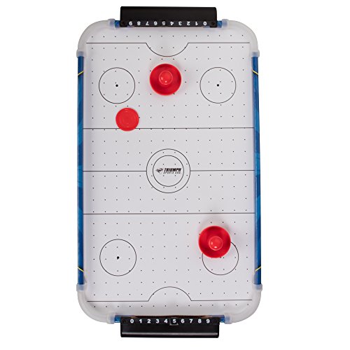 This sleek and stylish 20" Lumen-X Table Top Air Hockey will add fun and excitement to any game room. The arcade-style table features cool graphics, a manual scoring system, and a powerful motor that provides real air powered action fun for all ages. It also comes equipped with LED lights in the corners to light up the action! It's size allows you to play this game wherever you please. On the floor or on a table top, this air hockey table will go wherever you want! If you love air hockey and real hockey or just some friendly competition, this air hockey table is a must have! Table measures 20-inches in length and includes two red pushers and two red pucks. All of the fun, action-packed features of this game exhibit why Triumph Sports products are always a favorite.
