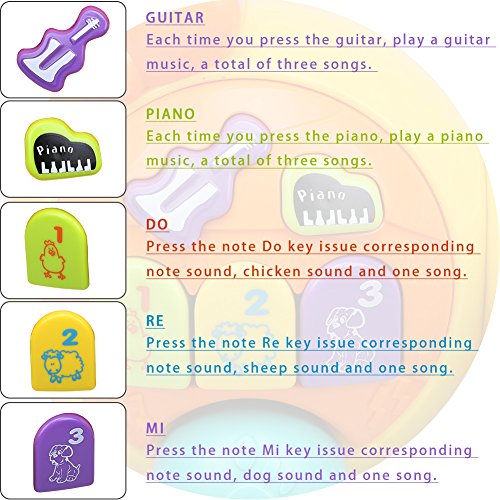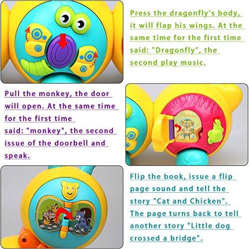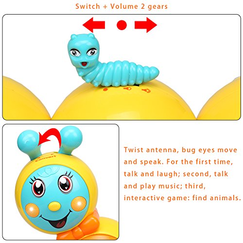 -. Feature : BOYS/GIRLS BABY TOYS -- The Caterpillar toy Inspires sensory exploration, tactile development, fine motor skills, imaginative play, audial development, color learning; strengthens matching skills, visual-spatial skills. A variety of colors, random delivery. / MAIN FUNCTIONS -- Multiple functions are attractive to your baby. Twinkling lights and pop up music work simultaneously. A good musical toy to improve kid's intelligence, imagination and creativity. Interactive baby game. Listen to music and stories. Piano function, guitar function and glide function. / INTERACTIVETODDLER TOYS -- Harmony with colorful colors, exercise the baby to identify a variety of colors; light-up buttons introduce animal names, animal sounds and shapes. / EARLY LEARNING CENTER -- Twist the bug body and slide the animals to develop fine motor skills. Turn the book page, book page tells two stories. Open and close the door to hear playful phrases. / SAFE MATERIAL -- Babies toys made from high quality ABS plastic, nontoxic, environmental friendly to kids. Round edge design protects your kid's little hands. High quality speaker sounds clearly, and with one button switch three modes for adjusting the volume. Recommended for ages 18 months and up. Batteries not included.
